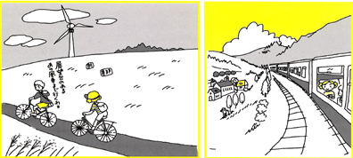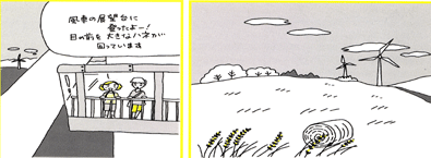 使えるものはとことん使う、このもったいない精神と ゆったりしたぜいたく感がふしぎとマツチしているんだ。 さて、列車が北へ北へと走るにつれて 窓の外に点てんと見えはじめたのは発電用の風車です。 ドイツは2050年までに 国全体のエネルギーの半分を自然エネルギーでまかなう計画なんだって。 だから南は太陽光発電、北は風力発電に力を入れているのよ。