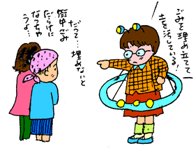 担任の先生の1人がごみや環境問題を勉強され、ごみ・環境ビジョン21発行の絵本“いのちのまちをつくる…ゴミのへらしかた”を読みこのコンセプトにした学習を組み立て、発表したいとの構想を作りました。