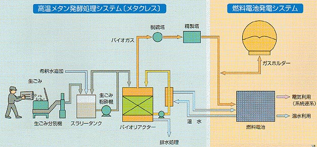 高温メタン発酵式有機性廃棄物処理システムは連続運転をしているが、連続発電は行っていない。また短期的な実験で電力事業法の関係もあり、所内使用・売電はせず疑似負荷装置に供給(消費)している。下のシステムの全体フローでは(系統連系)と商用電力網との接続機能が書かれている。この機能を持てば所内使用・売電が可能となる。