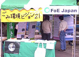 FoE Japanとは「ごみを持ち込まない生活」と題したリーフレットを共同制作し、いのさんの苦心の作である掛け軸型パネルを展示し、テントの前には新規に作ったごみかんの横幕も掲げました。