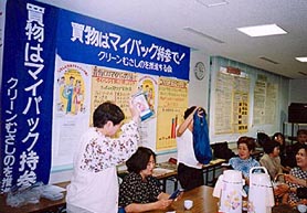 市内で開かれた環境キャンペーンや消費生活展の参加を経て、いよいよ来る7月15日には某スーパーの店頭でオリジナル・ロゴ入りエプロン、横断幕、ノボリ旗で初の「街宣デビュー」! 行動はボチボチでも、“オリジナルグッズ”だけは、先輩・北本市(埼玉県・数年前から買い物袋持参運動に取り組んでいる)にも負けていません。