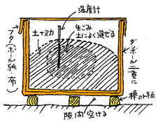 2、3日経って温度が下がり始めたら、また3分の1ぐらいを入れる。これを繰り返していけば1週間で処理が終わる。 箱の中が少し増えたら(細かいのをフルイにかけて取り出し、1カ月ぐらいしたら、堆肥としてプランターで花の栽培などに使える。 |