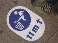 シールにはそれぞれキックをする人形が。ゴミ箱が近くにあることを「11m」シールで示唆し、サッカーにからめてポイ捨てを防ごうというものです。