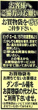 買い物袋持参の呼びかけやレジ袋有料化の告知は、レジの所に天井から吊り下げられた案内板やレジに張られたPOP、それにチラシで行っています。