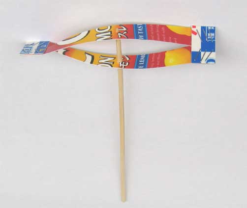 小学校低学年の子どもたちには定規の使い方から説明します。 切り取った短冊の中央に千枚通しで穴を開け、ホチキスで両端をとじ合わせ、竹串を差し込んで完成です。